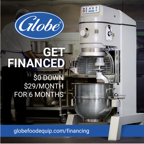 Middleby is now offering financing options for Globe Equipment Company customers. They're available for qualifying purchases by customers within the 50 United States and Puerto Rico, USVI, and Guam, and can include payments of $29/month for the first six months (with regular payments thereafter, no money down, fast credit decisions [usually in minutes], and terms up to 60 months with affordable monthly payments.)